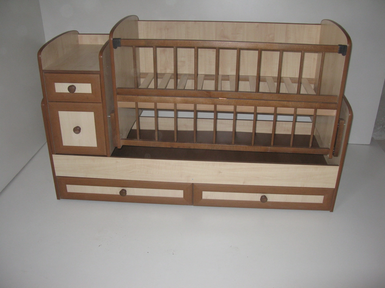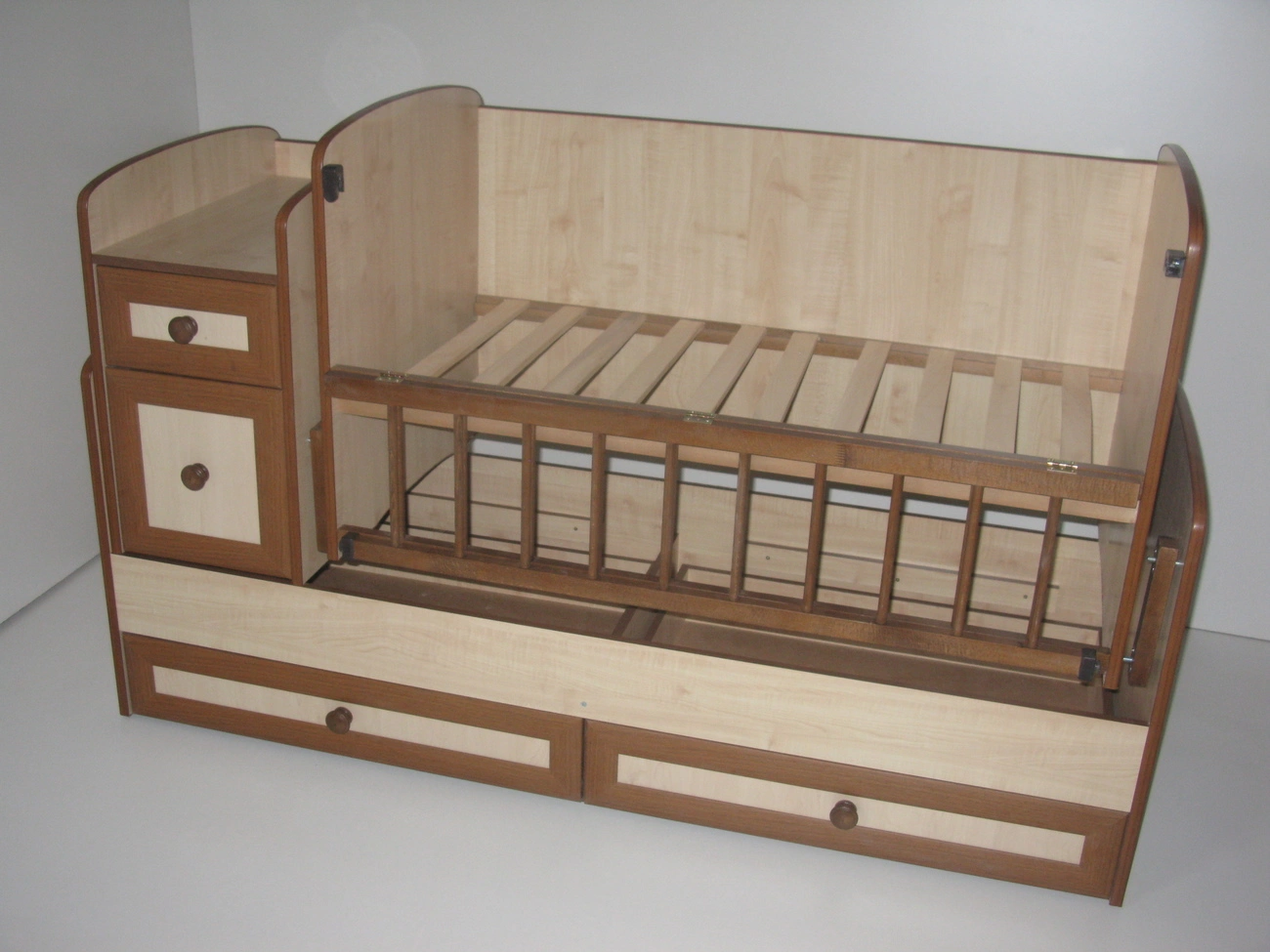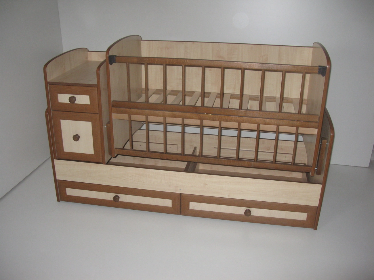 Ліжечко має відкидну боковину, підшипник, трансформується в комод,